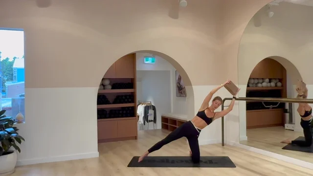 Join sarah for this abs and ass flow with the block. If you don't have a block at home you can also do this without!